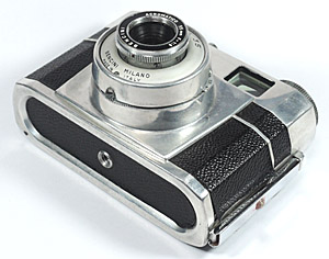 | 120または127フィルムを使って天下の単純カメラを作っていたベンチーニも、1954年に生産したこのカメラから35mmカメラに進出しました。この頃は127の末期でしたんで、さすがにベンチーニも「こりゃあかん」状態になったんでしょうね。でも、裏紙があってコマ送りも赤窓でできたそれまでのカメラと違いまして、35mmとなると製作にはそれなりの労力が必要ですが、それでもまあ、せっかくの35mmということもあってか、ベンチーニには珍しくシャッタースピードも絞りも多少選択できるようになってます。 | |