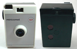 天下の単純カメラ、ベンチーニ様のお出ましです。このメーカー、マジですごいですよ。ダースト・ドゥーカもクロスター・スポルトも顔負け、天下無双のシンプルカメラを最初から最後まで一貫して作り続けた偉大なメーカーなんです。このベンチーニよりシンプルなカメラとなると…、うーん、写るんですの初期型くらいかなあ。あ、あれにはカウンターがあったから、やっぱこっちの方がシンプル(^∇^)! このカメラが登場したのは53年。C.M.F.からC.M.F. Benciniになって後述するRolet、Relexを経てベスト判のCometが最初に登場したのが48年でして、以降、127フィルムと135フィルムを使用するものに、主にコメット名が使われました。でも、Korollの名前が使われるようになると、51年から53年までは120から135まで、どれもがコロール某になっちゃって、訳が分かりません。53年に思い出したようにこのコメットIII型を発売したのですが、いきなりすっ飛んだデザインでの登場に、そりゃもう「何これ〜」と思われたことでしょう。明らかに変ですもんね。 |
