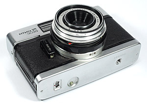 | ボディはヴェラマチックのような見た目の安っぽさは見られませんが、手にしてみると同レベルの日本製のファミリーカメラに比べて妙に軽いです。軍艦部と底蓋が金属製のカバーのために騙されてしまいましたが、本体はアルミダイキャストではなくて、プラスチック製なんですよ。おかげで、相当生産コストは抑えられているのでしょうが、「カメラ=高級品」みたいな60年代の日本人的な発想ではこうした大胆なことはできなかったでしょうね。日本では70年代から、本体が金属でカバーがプラスチックを採用するメーカーが増えましたが、ヨーロッパのファミリーカメラは逆のパターンなんですね。 | ![]() |