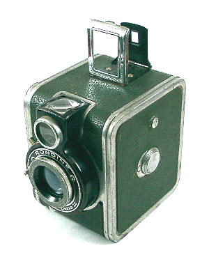 1948年、フェラニアはファルコのようなスプリングカメラと単純なボックスカメラを作っていましたが、このロンディネーはボックスカメラの代表選手ですね。127フィルムを使うとてもちっこいカメラで、機構もベンチーニ並に単純です。でもデザインはさすがにイタリー。とても可愛らしい印象で、結構今になって人気が高いんだそうですよ。ちなみに当時は黒・赤・青・緑・茶という具合に、レザーの色を選択できたんですよ。 127フィルムを使いますが、サイズはスクエアではなく4.5X6cmで、縦長になります。こんな小さいカメラなのに立派でしょ? でも、厳密には4.2X5.7cmという感じですが。それにしても、この小ささで35ミリカメラよりも面積の大きなフィルムを使うんですから、考えてみると驚きものですなあ。 |