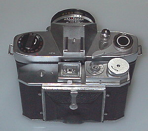 左は127フィルムを使うミニヨンII型。1939年に発売され、戦後も作られた4×5判カメラである。レンズはトーコー・アナスチグマット6cm f3.5で、シャッターは精工舎のリヒトが装着されている。巻上げがI型後期のモデルから自動巻き止めになり、ファインダーもニュートン式が装着された。 背面には月ごと・撮影条件ごとのおおよその露出換算表が貼り付けられ、これをケースの裏側の一部分を倒してすぐに見られるようにしているのは親切である。といっても、シャッタースピードがB・T・25・50・100しかない上、当時のフィルム感度を考えるとおのずと撮影場面は決まってきそうではある。 このカメラの最大の特徴はフィルムを軍艦部を外した上面から入れてセットすることである。私が初めに手にした時は一体どうやってフィルムを装着するのか悩んだが、まさか上から入れるとは思いもよらなかった。正面から見てファインダーの左にあるボタンをスライドさせて取り外すようになっている。 軍艦部のみならず、各部にレバーやボタンが付けられ、ワンタッチでファインダーや正面のカバーなどが開くようになっている。 巻上げは初めに背面の赤窓でスタート点を合わせ、以降軍艦部後部のボタンを一度チェックしてストップするまでダイヤルを回せば自動巻き止めになる。 |
