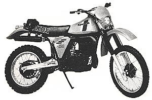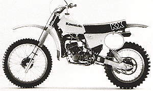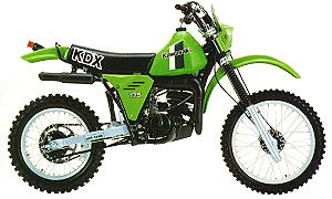 カワサキKDX250 81年型KXのエンデューロバージョンで、翌82年にデビューした。エンジンはKXから4.5psダウンの33ps/7000rpmで、やはり中速よりに設定されている。足回りは最新のもので、その性能も最高であった。消音を徹底させるために異常に長いサイレンサーが取り付けられている点が目に付く。国内に逆輸入されたことはほとんどなかったと思われる。これにもやはり420ccモデルが存在する。 |