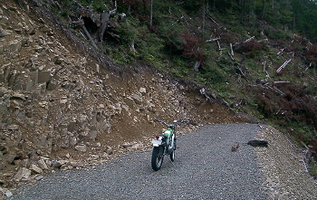 路面の質は荒れていると言っても比較的新しい砂利が随所に撒かれており、崩れてきた石が多いものの、いかにも道が新しいことを証明していた。 |