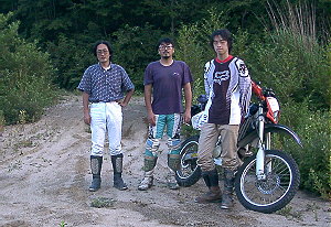ところが、私のサイドワインダーがどうも調子を崩していて、いまいちすっきり回転が上がらない。しかもアクセルを少し回すとキンキンいってしまって、えらく心配になってきた。おそらくガスがどういう訳か薄くなってしまったのだろう。これは車に戻って調節しないといけないようだ。 浅見川林道の雰囲気は以前と変わらず、うっそうとした川沿いの暗い道である。土質の走りやすい道だが、再びZYNくんはフロントを取られたらしい。MXの練習をしている彼も、林道の滑りやすさに体もコワばってしまったようだ。 |