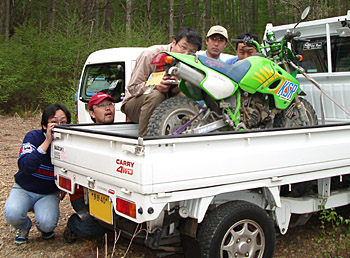 3段目のひろさん&おたま号は多分そこらへんの250トレール乗りではとても付いて行けないだろう。とにかく全開。いくらおたま号と言えども、80ccゆえかなりのスピードになる。そりゃあコーナーの立ち上がりや登りのスピードは並みのライダーが乗っても250の方が速いに決まってるが、このコーナー画像のように走られると直線で離してもすぐ追い付かれてしまうだろう。それにしてもハンドルのグリップと路面の距離は一体何cm?